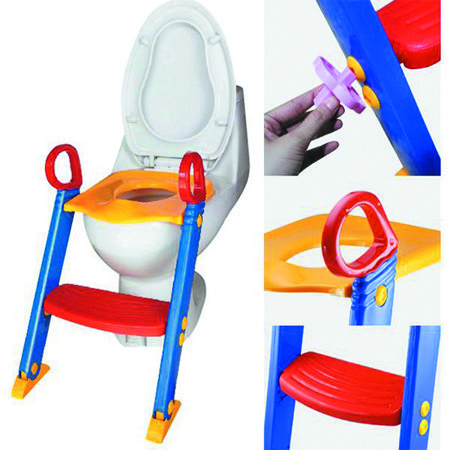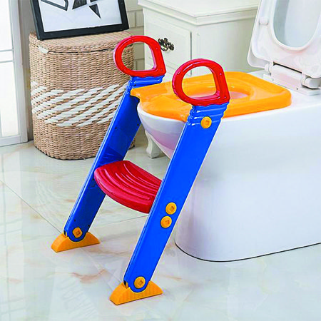 مقعد تدريب الأطفال على الحمام مزود بأرجل قابلة للتعديل مع سندات مطاطية لمنع الانزلاق وله درج يسهل له الصعود